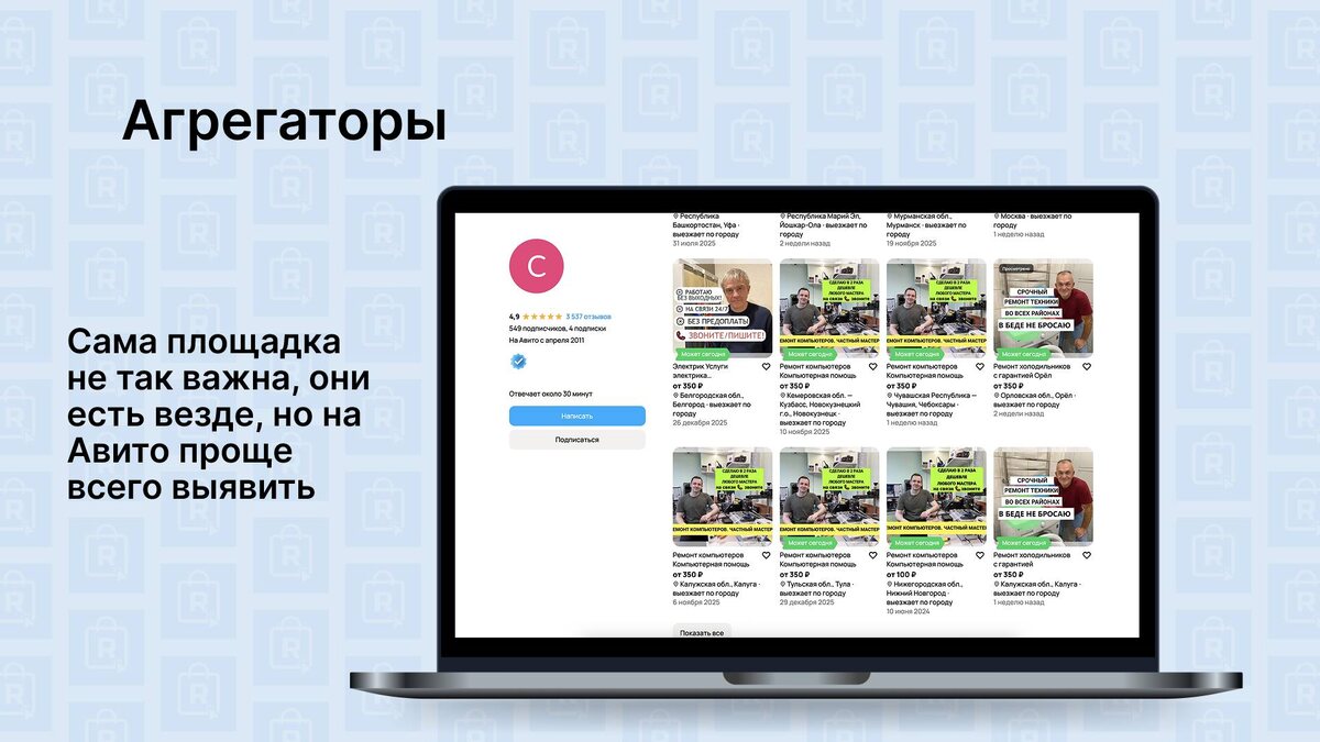 ? Компания, которая привлекает и распределяет заявки между своими сотрудниками под существенный процент. Преимущества работы с площадкой 👍 Не нужно вкладывать в рекламу и заниматься ею самостоятельно: фирмы все берут на себя. 👍 Нет ответственности за рекламу: просто получаете заявки. 👍 Хорошая школа по повышению чека и работе с клиентами (хотя спорная с моральной точки зрения) 👍 Возможность работать с в новых городах и расширять арсенал ремонтируемой техники. Для новичков это неплохой способ набрать опыт 👍 В редких случаях — честные агрегаторы с хорошим руководством, где мастерам комфортно Недостатки работы с площадкой 👎 Огромная доля выручки уходит агрегатору (40-60%, иногда больше): на дистанции это ощутимо, особенно если отдавать 60-70 тыс. руб. в неделю 👎 Давление на раздувание чека: вынуждены навязывать лишние услуги, что приводит к плохим отзывам и низкому сарафану 👎 Вся ответственность на мастере (включая уголовную): агрегатор юридически не связан с выполненны