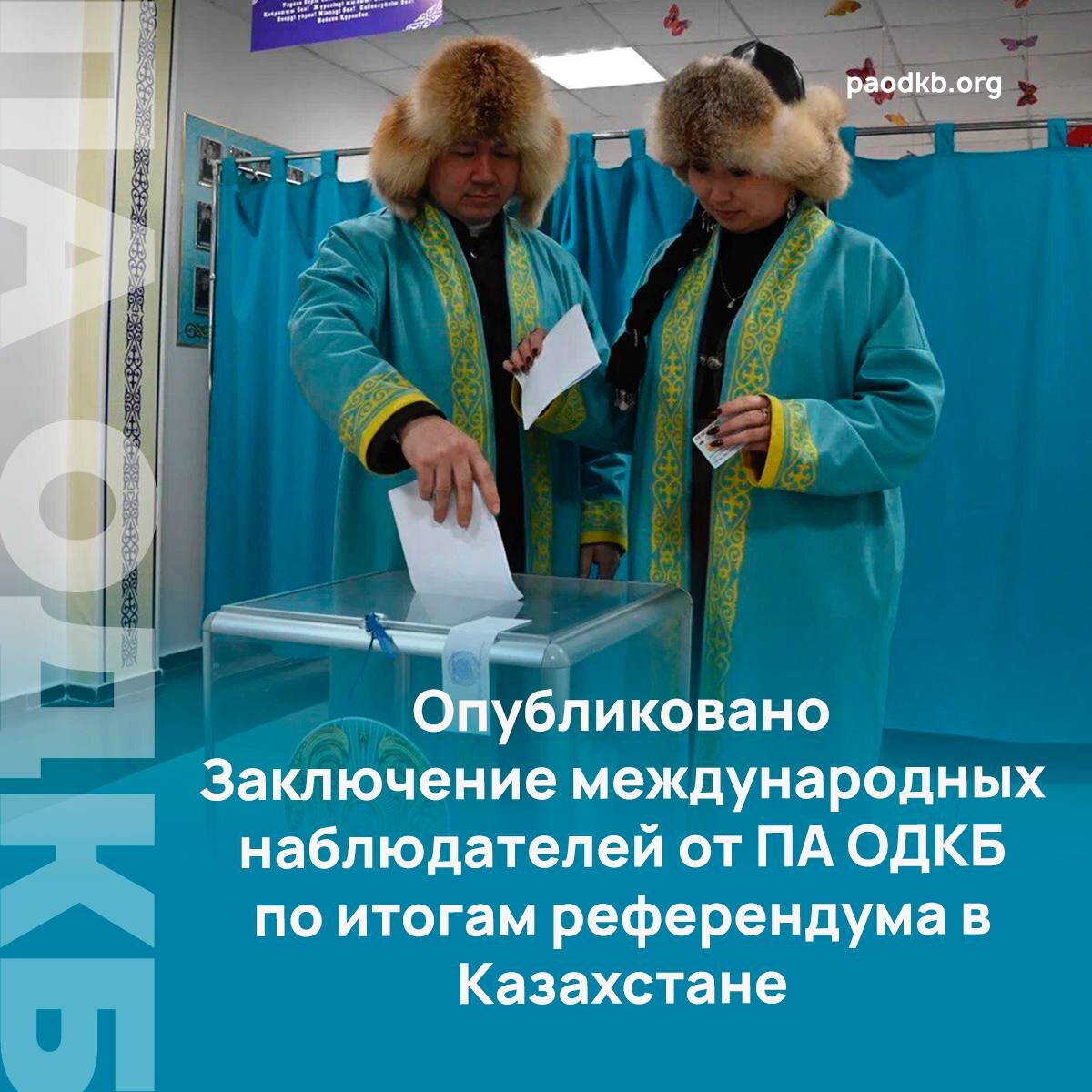 конституционного референдума в Казахстане, состоявшегося 15 марта 2026 года. ▶️В документе отмечается, что референдум прошел в соответствии с национальным законодательством и международными стандартами. В состав группы международного наблюдения во главе с представителем Кыргызстана Улукбеком Узакбаевым вошли парламентарии государств-членов ОДКБ, которые осуществляли мониторинг на всех этапах избирательного процесса. 🇰🇿 15 марта 2026 года международные наблюдатели посетили 11 участков в Астане и Акмолинской области, присутствовали на различных этапах проведения голосования. Участки для голосования открылись в установленное время, были обеспечены необходимыми документами, оборудованием, информационными материалами. Члены группы не выявили жалоб на качество подготовки списков участников референдума, процедуру выдачи бюллетеней, а также порядок голосования. ✅В Заключении отмечается, что прошедшие выборы отличаются широким участием международных и общественных наблюдателей. Для наблюд