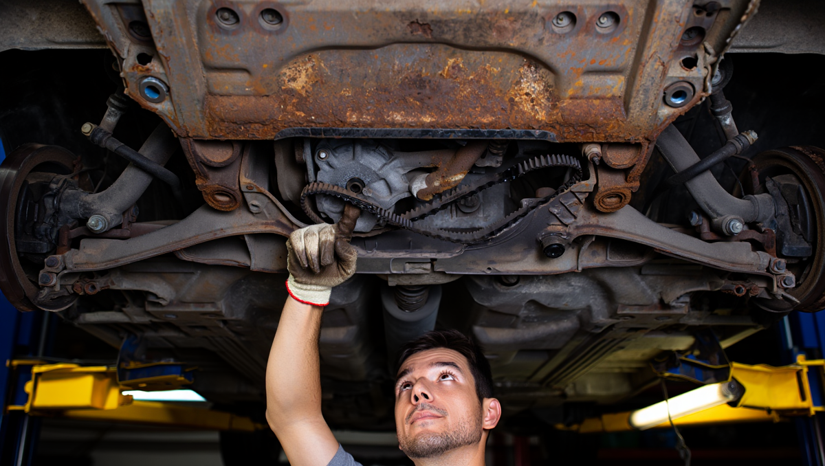 Осмотрели снизу. Заводской антикор давно облез. На порогах и в арках колёс — рыжий налёт, начало процесса. Не катастрофа, но если ещё пару лет игнорировать — будут дырки.