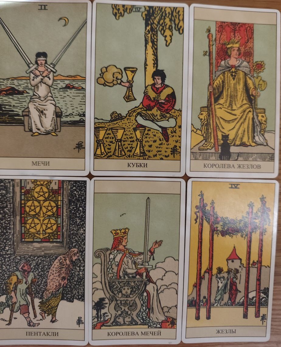 Карты: Мечи 2, Кубки 4, Королева Жезлов, Пентакли 5, Королева Мечей, Жезлы 4