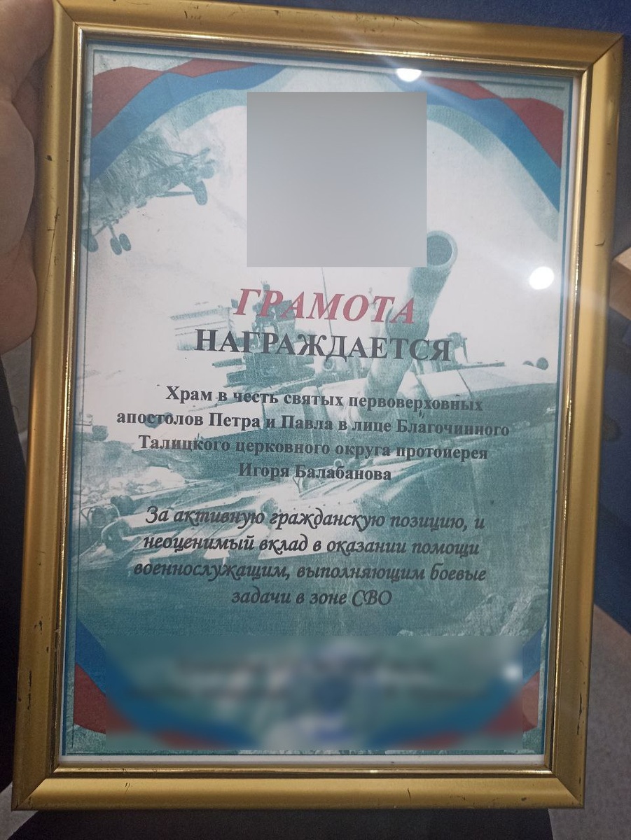 Награду вручили на заседании Общественной палаты города Талицы за активную гражданскую позицию и вклад в оказание помощи военнослужащим, выполняющим боевые задачи в зоне СВО. Отметим, что прихожане храма во имя святых первоверховных апостолов Петра и Павла города Талицы активно помогают военнослужащим в зоне специальной военной операции. Силами прихожан собираются денежные средства, гуманитарная помощь, а также готовятся ретор-пакеты с консервами для солдат.