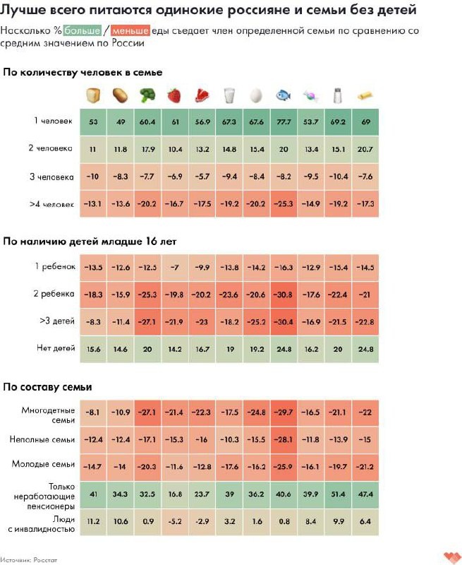 Семьи с детьми (даже только с одним) потребляют меньше среднего по всем продуктам, но самое печально - что сильный провал по полезным продуктам (овощи-фрукты, рыба-масо) Основной компенсатор калорий - сахар (80 грамм в день, 2,5х дневной нормы ВОЗ - привет сосудам и хроническому воспалению) и жир (40 % калорий вместо рекомендованных ВОЗ 30 %) Ну а первое, от чего отказываются заботящиеся о здоровье потребители в мире - переработанное мясо (колбасы, сосиски и полуфабрикаты) - у нас ежедневно ест 40 % детей и взрослых Продукты глубокой переработки, такие как сосиски, колбасы и кондитерские изделия, в изобилии содержат соль, насыщенные жиры и сахар, избыток калорий при дефиците питательных веществ Раньше обсуждали, что в России высокая доля семейных бюджетов идет на еду, уже около 35 %, а у бедных - больше половины Это история одновременно и про экономику, и про культуру потребления По рейтингам качества питания Россия и США близки Разница в продолжительности жизни в США между бедн