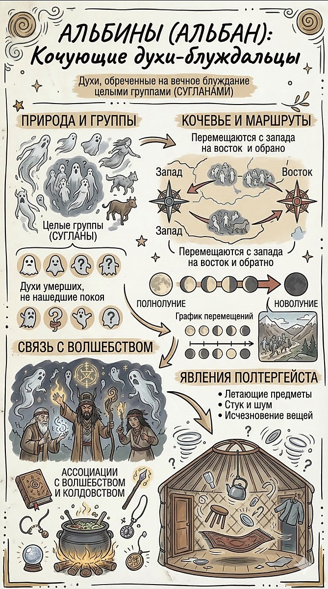 Альбины — это «блуждальцы», обреченные на бесконечные странствия. Они перемещаются не в одиночку, а организованными группами — сугланами. Кочевье и лунный цикл Духи движутся караванами с запада на восток и обратно. Время их активности — мистический период между полнолунием и новолунием. Считается, что в это время граница между мирами становится максимально тонкой. Явления полтергейста В народных поверьях именно Альбины виновны в явлениях, которые сегодня называют полтергейстом: - Стук, шаги и шумы в пустых помещениях; - Левитация или внезапное перемещение вещей; - Бесследное исчезновение предметов. Это тени, не нашедшие покоя ни в одном из миров и ставшие частью вечного мистического эха нашей земли. Канал нашей студии https://t.me/chimitdorzhi_studio