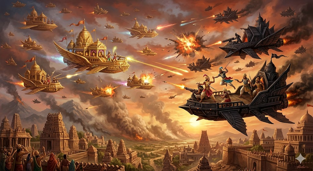 📸 Представьте: 5000 лет назад над Индией кружат "тарелки". Из кабины выглядывает бородатый пилот в дхоти и проверяет по санскритскому манускрипту уровень ртути в топливной системе. Его напарник кричит: "Братан, включай "зеркало Пинджулы", а то сейчас эти атланты нас своими "дьявольскими лучами" поджарят!"