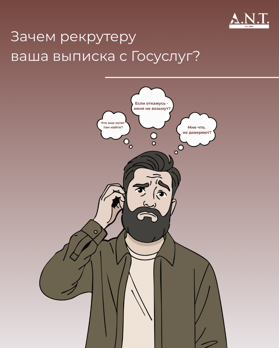 Вы уже прошли все этапы отбора, и теперь рекрутер просит выписку из трудовой книжки с Госуслуг. Дело в том, что кандидаты всё чаще доверяют написание резюме нейросетям. И в данном случае выписка из трудовой помогает подтвердить или опровергнуть: опыт кандидата, продолжительность работы, занимаемые должности и причины уходов. ДА. Кадровые агентства работают в рамках Федерального закона №152-ФЗ «О персональных данных», что гарантирует конфиденциальность и защиту предоставленной вами информации. В ТК РФ нет статьи, которая бы обязывала кандидатов предоставлять выписку из трудовой книжки. Однако отказ может вызвать вопросы у работодателя и снизить шансы на трудоустройство, так как без выписки рекрутер не сможет подтвердить ваш профессиональный опыт. А вам приходилось отправлять выписку из трудовой? ➡️ Присоединяйтесь к А.Н.Т. в MAX ➡️ Присоединяйтесь к А.Н.Т. в TenChat