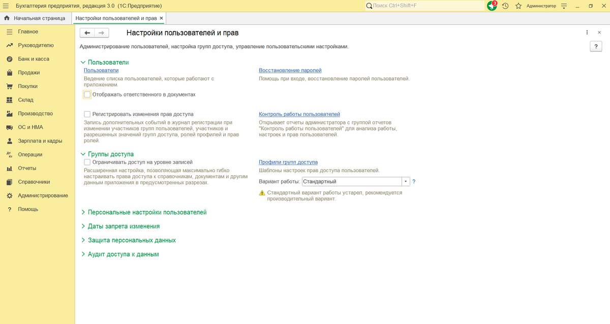 В 1С:Бухгалтерия можно легко настроить автоматическое заполнение ответственного лица при создании документов. Это поможет контролировать, кто работает с каждым файлом, и упростит работу команды (кроме случаев, когда значение поля "Ответственный" было изменено вручную). Зачем нужна эта настройка Автоматическое заполнение поля "Ответственный" позволяет видеть автора документа и текущего исполнителя без ручного ввода. Руководитель или бухгалтер сразу поймет, кто создал файл и/или отвечает за него, что важно в многопользовательском режиме. Это стандартная функция 1С:Бухгалтерия, не требующая доработок или расширений. Пошаговая инструкция по настройке 1. Откройте раздел Администрирование-Настройки пользователей и прав. 2. Раскройте блок Пользователи и поставьте галочку в пункте Отображать ответственного в документах. Настройка применяется для всех пользователей, нужно перезайти в программу для применения. После активации создайте тестовый документ - поле "Ответственный" заполнится вашим п