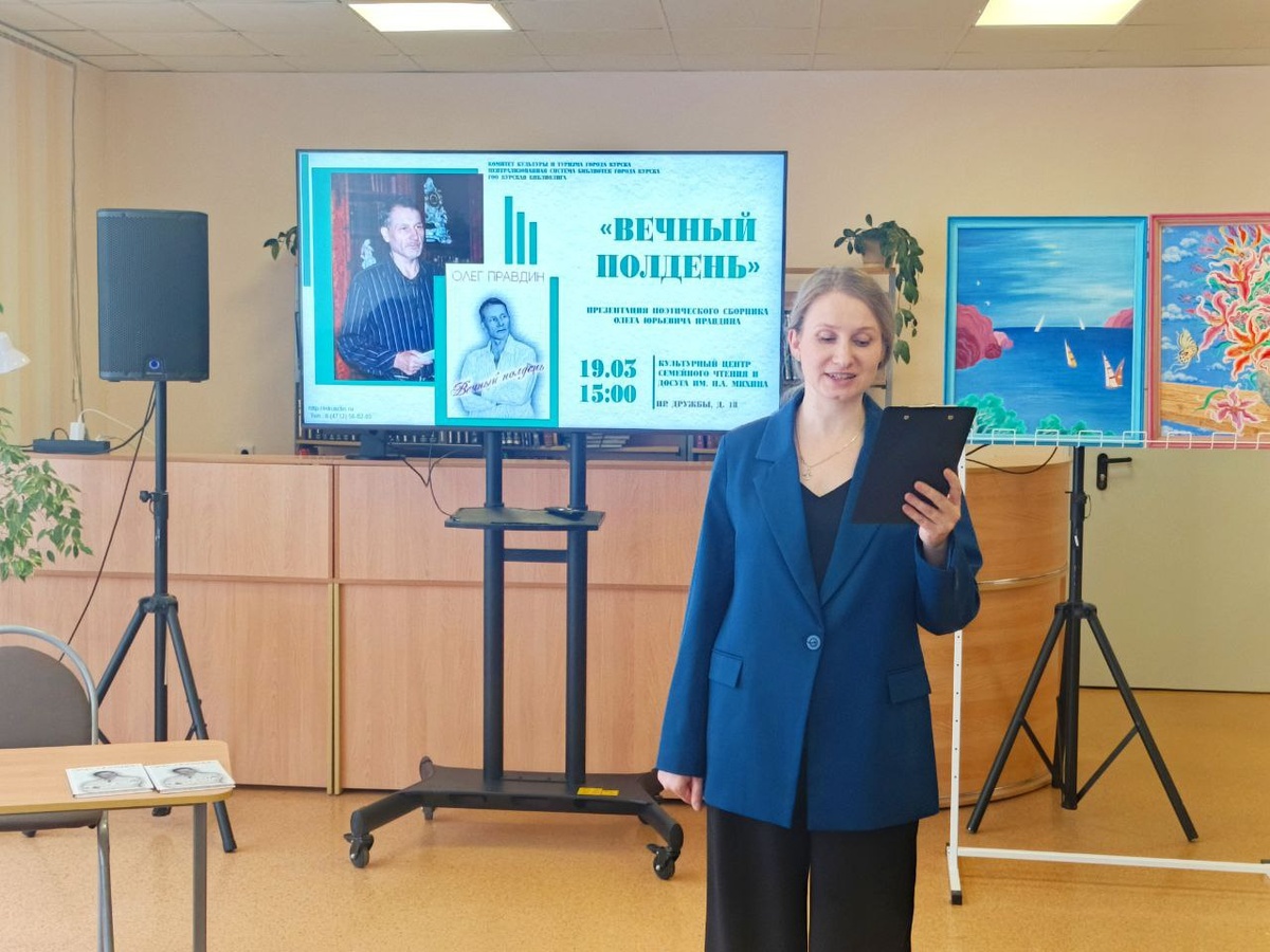 А. Михина состоялась презентация сборника курского писателя Олега Правдина «Вечный полдень» Его представил друг и коллега Олега Юрьевича, член Ассоциации ветеранов СВО, курский поэт Дмитрий Кутепов. В 2023 году курские писатели провели конкурс памяти Олега Правдина. А в этом году издали поэтический сборник, в котором собраны произведения этого автора. Олег Юрьевич Правдин – художник, композитор, автор более 300 стихотворений, известный среди читателей и коллег по перу, для которых он был другом и наставником. В июле 2019 года поэт ушёл из жизни. Ему было 57 лет. Гости мероприятия не только ознакомились с творчеством Олега Правдина, но и приняли участие в чтении избранных стихотворений и обсудили ключевые темы в поэзии, искусстве и жизни. Юрий Ворохта поделился воспоминаниями о друге: – Олег был очень разносторонним человеком: рисовал картины, писал стихи, мастерил различные поделки. Одно время он занимался спортом. Интерес к нему он привил и своей дочери. Мы все время подд