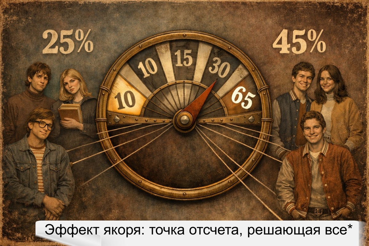 Прорыв случился в 1974 году благодаря двум исследователям, которых сегодня называют отцами поведенческой экономики Даниэль Канеман и Амос Тверски. Их гипотеза: даже случайные числа, которые никак не связаны с вопросом, могут влиять на наши ответы. То есть мозг хватается за любую подсказку, пусть даже бессмысленную, и отталкивается от нее.