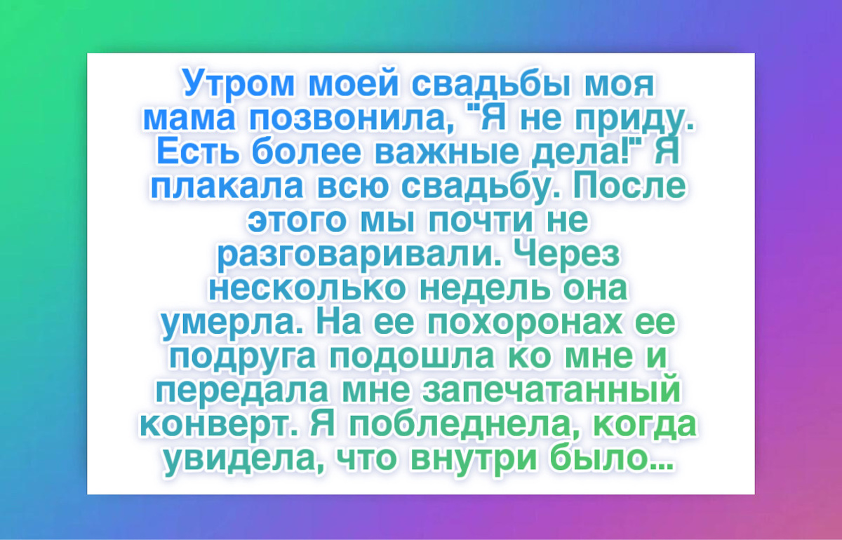 Через несколько недель она внезапно умерла. На похоронах ее подруга передала мне конверт. Внутри были выписка из больницы с датой моей свадьбы.