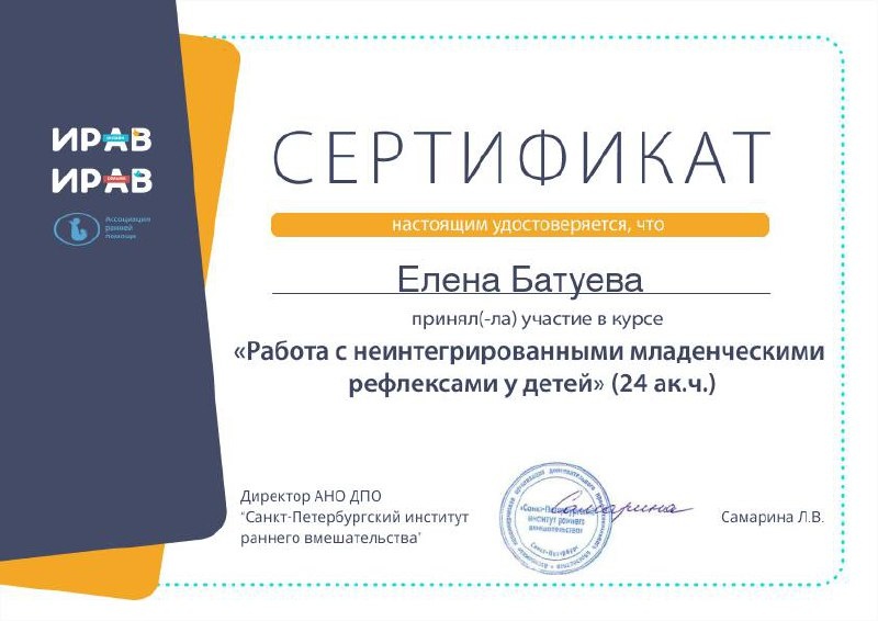 особенностями детей (и речь даже не идет про диагнозы), а именно особенности, связанные с неугасшими младенческими рефлексами, ведущие к нарушению сенсорной интеграции, что ведет в сложностях детей в коммуникации, социализации, адаптации, освоения учебных, бытовых навыков, самообслуживания, ухода за собой, развития речи, навыков питания и др. Пройдя этот курс в ИРАВ (институт раннего вмешательства) появилось осознание, что многое как психолог, я раньше видела через призму психологии и пыталась решать только инструментами психологии, но с лета 2025 года я все больше и больше убеждаюсь, что работать можно с детьми через простые телесные упражнения с детьми на встречах и регулярно дома, для родителей они, порой, кажутся странными и не связанными с проблемой, тем самым корректируя как бы психологические проблемы детей. Уважаю этот институт тем, что у них комплексный подход в работе с детьми, и у них я учусь не первый раз, и обрела опыт клинического мышления.