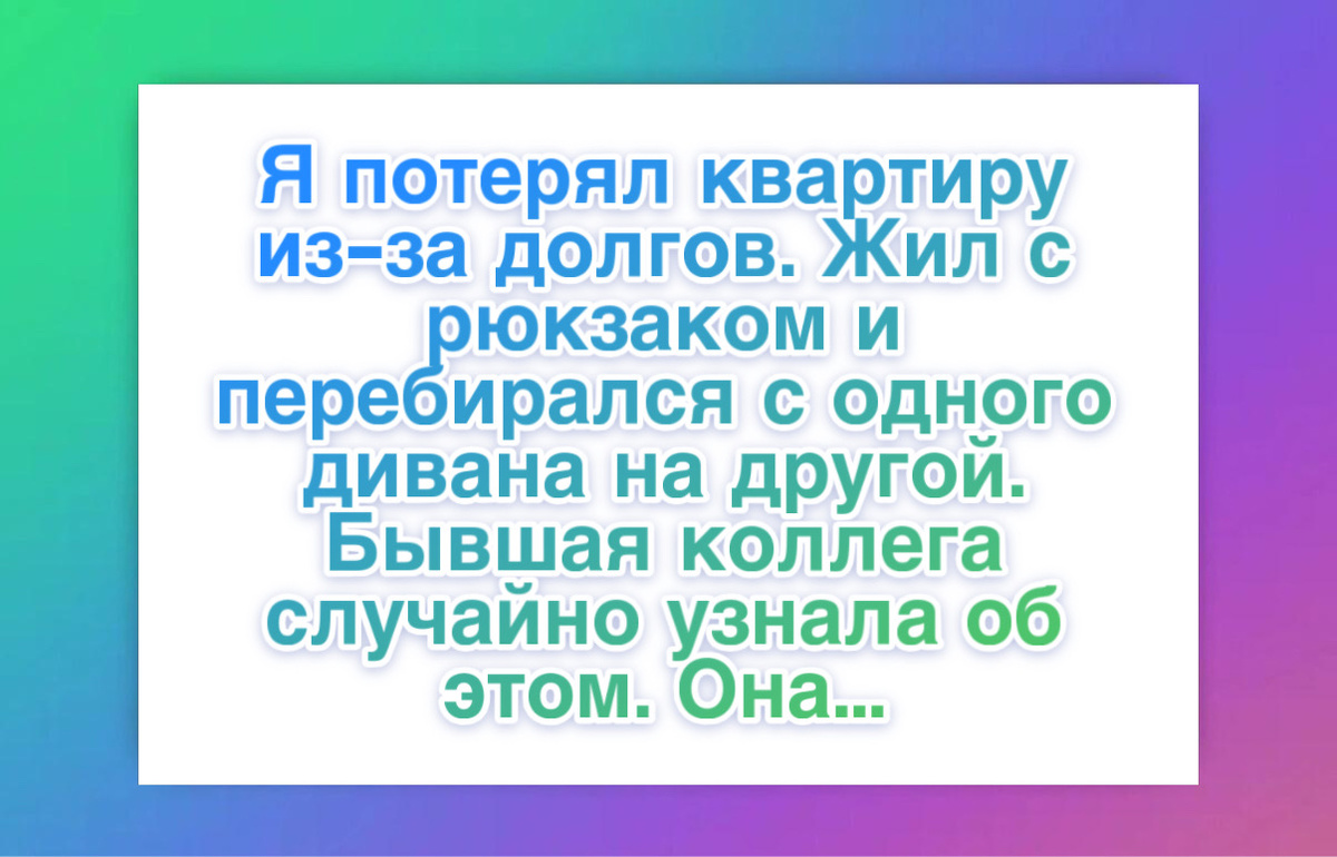 “Я потерял квартиру из-за долгов. Жил с рюкзаком и перебирался с одного дивана на другой. Бывшая коллега случайно узнала об этом. Она предложила мне свою гостевую комнату без ограничений по времени. Отложила переезд к своему партнеру, чтобы я не остался без крыши. Помогала договариваться с больницей и покупала продукты, когда у меня не было денег. Родственники отказались помогать, а она дала мне шанс начать заново.”