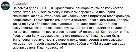 которых строилась как классическая пирамида (сверхрасходы покрывались геометрическим ростом притока нового капитала). Теперь, когда по сути образовалась дуополия - начался веселый процесс ошкуривания сотен тысяч лохов путем постоянного поднятия комиссий, логистики, введения всего и вся на платной основе 😂 Как говорится "на Руси, слава Богу, дураков лет на сто припасено". Какая может быть финансовая граммотность у нового поколения, воспитанного людьми, которые почти всей страной вкидывали бабки в МММ и заряжали воду смотря сеансы Кашпировского? Если у вас плохо прогружаются файлы, все посты также доступны в MAX: https://max.ru/marketplace_biz