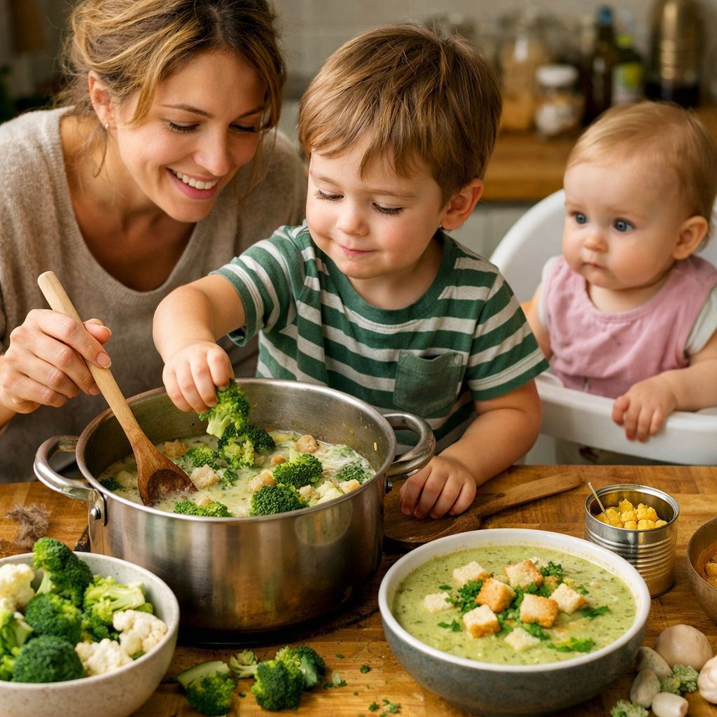 Дело было в обычный вторник. Тот самый день, когда у мамы троих детей энергия заканчивается примерно в 15:40. Я стояла на кухне и думала о вечном: чем кормить эту прекрасную, но очень избирательную публику? Максим требует «что-нибудь вкусное». Миша хочет макароны. Даша, как человек шести месяцев от роду, смотрит на меня глазами маленького гастрономического критика. И тут началось кино. Миша молча подтащил табурет. Забрался на него, как длинноногий молодой олень, и достал из холодильника… брокколи. Да-да. Брокколи! Я в этот момент буквально соскребала челюсть с пола. Он положил её на стол и объявил: — Мама, давай суп. Понимаете драму? Мой трехлетний ребенок добровольно предложил суп из брокколи. В такие моменты хочется открыть окно и кричать прохожим: «Посмотрите! Он ест овощи! Это я его родила!» Но проблема была в другом. Дети любят брокколи ровно до тех пор, пока она не оказывается в тарелке. И вот тогда я ушла в свой любимый режим — искать, читать, переводить, проверять. И наткнулась