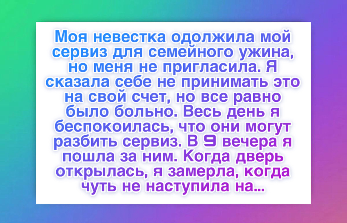 “Моя невестка взяла мой свадебный сервиз для ужина, но меня не пригласили. Мне было обидно. Я переживала за посуду и за себя. Когда я пришла за ней, я увидела дорожку из лепестков и накрытый стол. Она объяснила, что ужин был посвящен историям о моей семье, о моем браке, о том, как все начиналось. Она хотела сохранить эту историю. Потом она дала мне записку с благодарностью. Я ушла с чувством, что меня не исключили, а наоборот, сделали центром этого вечера.”