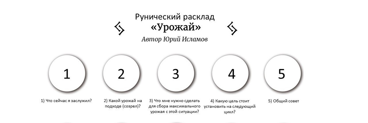 » Простой расклад для повышения эффективности в делах. 1) Чего я заслужил сейчас? Трезвый взгляд на свою реальность, как в плюсах, так и в минусах. 2) Какой урожай на подходе (созрел)? То, что вы долгое время повторяли в своей жизни и это начало приносить результат. 3) Что мне нужно сделать для сбора максимального урожая с этой ситуации? Совет по повышению эффективности и указание на точку роста. 4) Какую цель стоит установить на следующий цикл? Поможет учесть будущий вектор общего течения жизни. 5) Общий совет Общая рекомендация по улучшению производительности и результативности. Выпавшие руны при хорошей комбинации подходят как одна цельная руническая формула для повышения своей эффективности. (с) Юрий Исламов