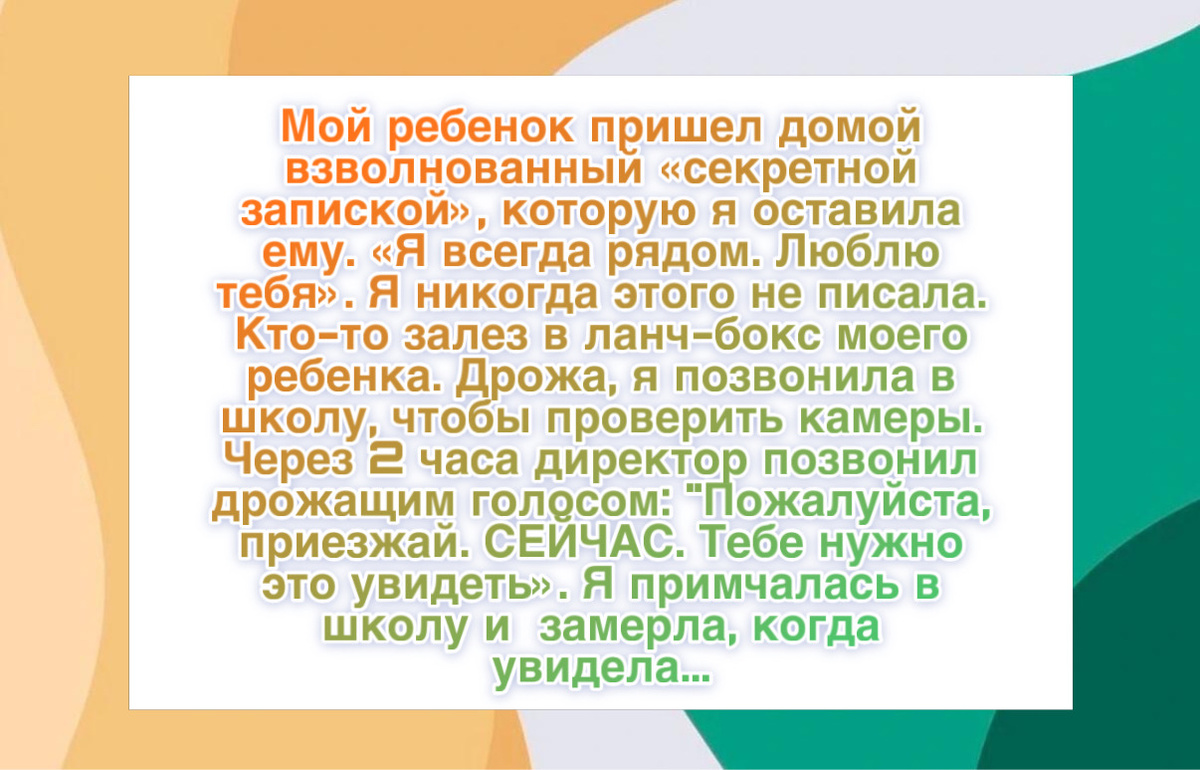 “Мой семилетний сын вернулся из школы и радостно рассказывал про записку, которую мама положила ему в ланчбокс. Я ничего не клала. В записке было написано: «Я рядом. Люблю тебя. — мама». У меня все внутри похолодело. Кто-то трогал вещи моего ребенка. Я сразу позвонила в школу и попросила проверить камеры. Через два часа директор позвонила и попросила срочно приехать. На записи я увидела, как старший мальчик кладет записку в коробку моего сына. Его звали Иван. Оказалось, он заметил, что мой сын сидит один, и начал тайно подкладывать записки разным детям. Не только моему, а двенадцати. Его мама умерла год назад и раньше писала ему такие записки. Он скучал и решил делать это для других. Школа хотела его наказать, но я настояла, чтобы этого не делали. Теперь он официальный «посол записок». И мой сын больше не сидит один. И он тоже.”