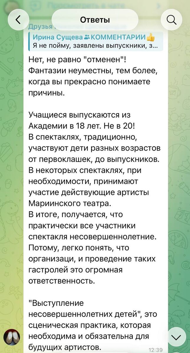 Базарные бабки сошлись на мысли, что экскурсовод - это недостойно творчества. А «друзья Цискаридзе ответили» на фото. Пояснили, что на сцену в Сириус выходят несовершеннолетние дети. Нет, я конечно, понимала, что дети тоже выходят, но что нам должны были привести только детей, тогда и стоимость должна быть детской. И тональность ответа, конечно тоже соответствует лучшей школе балета. А куры в комментариях -это отдельный мрак. Как представлю, что такие поклонницы сидят в зале рядом… Вот и выражай сожаления по поводу отмены концерта. Там еще меня комментаторы в перепродажах билетов обвинили и нарушениях налогового законодательства. Чувствую себя чуть-чуть Волочковой