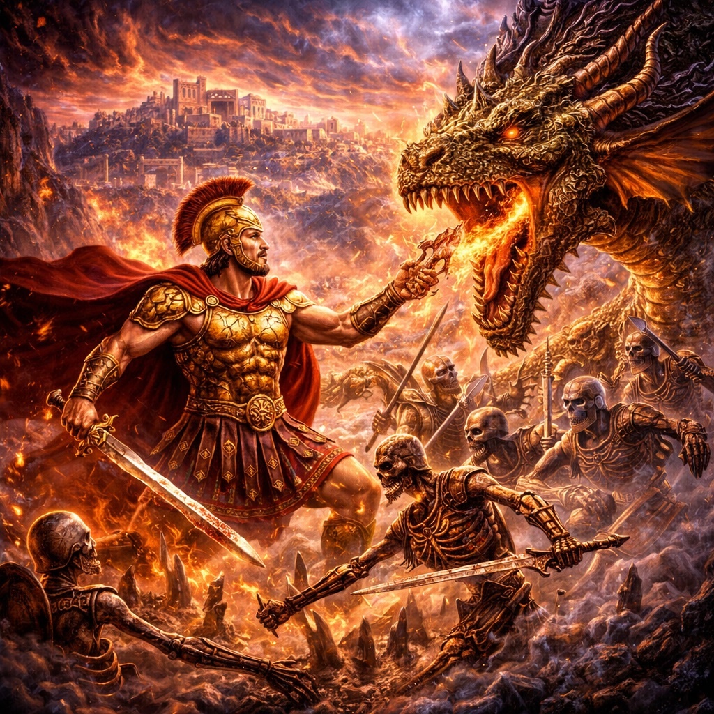 Кадм не находит то, что потерял, — он получает приказ основать то, чего ещё нет. Это и делает его фигурой особого типа. Он не возвращает прошлое. Он создаёт будущее. А такое создание в мифе никогда не бывает мягким. Оно требует жертвы, вторжения, убийства, сакрального преступления или столкновения с чем-то древним и страшным. У Кадма таким древним и страшным становится дракон.