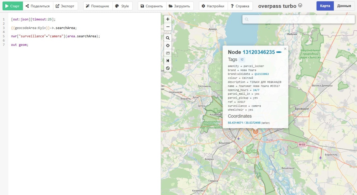 🔎 Есть инструмент, который я постоянно использую в расследованиях — Overpass Turbo. Это по сути веб-интерфейс к API Overpass, который вытягивает данные напрямую из базы OpenStreetMap. Звучит сложно? На деле всё просто. Даже если вы не умеете писать сложные запросы, там есть кнопка «Мастер» (Wizard). Вбиваешь запрос на обычном английском, а он сам конвертирует его в правильный код. 📎 https://overpass-turbo.eu Допустим, нам нужно понять плотность видеонаблюдения в определённом районе или городе. Заходим в Overpass Turbo и запрашиваем все камеры в Киеве. Код будет выглядеть так: [out:json][timeout:25]; {{geocodeArea:Kyiv}}->.searchArea; nwr"surveillance"="camera"; out geom; Это выдаст вам все отмеченные точки с камерами, которые нанесли на карту местные волонтёры или компании. 📱 Telegram | 🌐 ВК | 📲 MAX