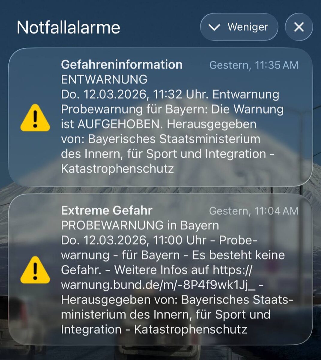 📢 На прошлой неделе в Баварии проводилась проверка систем оповещения. Мы надеемся, что вы уже пришли в себя от пережитого стресса из-за резкой вибрации телефонов, и готовы выписать в словарик полезные слова и выражения. ▫die extreme Gefahr – чрезвычайная опасность ▫die Probewarnung – пробное предупреждение ▫es besteht keine Gefahr – опасности нет ▫die Entwarnung – отбой тревоги ▫die Warnung ist aufgehoben – предупреждение снято Мы надеемся, что вам больше никогда не придется получать такие оповещения, но выражения на всякий случай запомните ❤️ Большое спасибо нашей студентке, приславшей этот скриншот 🔡 🔡 Учиться с нами
