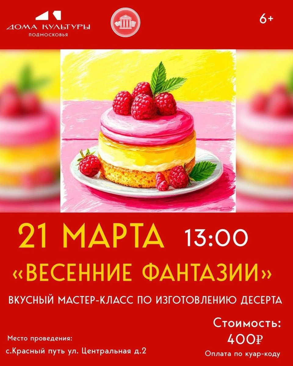 ✨ СДК «Русь» приглашает 🍨🍨 Состоится мастер-класс «Весенние фантазии», по приготовлению профитролей. 🍨🍨🍨🍨🍨🍨🍨🍨🍨🍨 Не откажите себе в удовольствии и устройте себе и своим близким - вкусную субботу! 🍨🍨🍨🍨🍨🍨🍨🍨🍨🍨 Все ингредиенты предоставляются! Ждём Вас на дигустации нового десерта от Галины Аносычевой! 🚫 Возраст: 6+ 📆 21.03.2026🕒13:00 🏢 Сельский дом культуры (СДК) «Русь» 📍 г.о.Домодедово, с.Красный Путь, ул.Центральная, д.2 💰 Цена: 400 ₽ ✅ Мероприятия Домодедово https://dzen.ru/id/66f10385cc4c5a16f7b5fb02 https://vk.ru/domodedovo_events http://dzen.ru/domodedovo_events