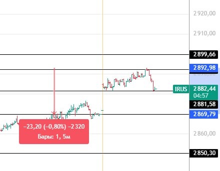 Технически у нас есть четкий лой и хай. Что является локально ур под и сопр. Сейчас мы упали на Лой дня, возможен отскок, технически пробой ЛОЯ открывает дорогу на закрытие гэпа на 80% по АТР __________ Все внимание на нефть НО тенденция такая какую описывал с утра, растущая нефть в моменте не является драйвером роста рынка а просто его поддерживает Нефть с утра выросла более чем на 6% при этом ММВБ поднялся всего на +3% с учетом того что более 50% инструментов были хуже рынка. Сейчас нефть в моменте слили -3% и ММВБ растерял ВЕСЬ свой дневной рост. ___________ Так что логика на день абсолютно верная, шорт более чем обоснован. Придерживаюсь плана, держу шорты