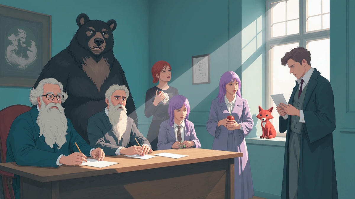 Приёмная комиссия оказалась большой комнатой с длинным столом, за которым сидели три мага в мантиях. Двое были пожилые, с бородами и в очках, а одна — молодая женщина с острым взглядом и неестественно фиолетовыми волосами. Перед ними стоял длинный стол, за которым скучали несколько абитуриентов.