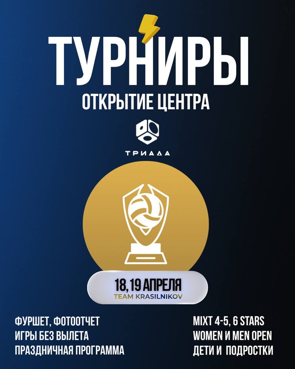 " 🏆18 и 19 апреля, 📍Триада (Карбышева 9). 🔡Формат: Группы + финальные игры в сетке (не сайд - аут). 🔣 Номинации: Mixt Next/Next+ (2 сесси) Mixt Light/Medium Women Open Men Open Дети: 7 - 12 лет Подростки 12 - 16 лет ⚡Для вас на праздничном турнире: 🔣Большой фуршет со сладкими напитками, сытными и сладкими закусками для наших участников. 🔣Призы: подарки для победителей от Team Krasilnikov и наших партнеров. 🔣Фотографии и видео: профессиональные фотографии станут отличным напоминанием об этом дне. 🔣Та самая праздничная и дружеская атмосфера турниров Team Krasilnikov. За которой вы каждый раз приходите именно к нам! 🛫 Заявка через сайт турнира.