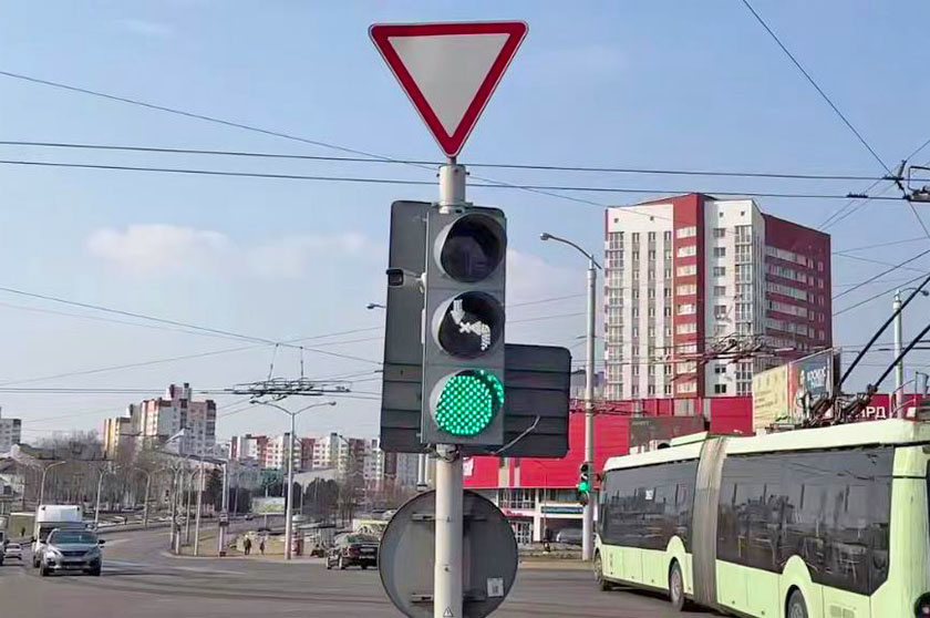 На нескольких перекрестках в Минске появились светофоры, которые напоминают о необходимости предоставления преимущества пешеходам и автомобилям при повороте налево или направо. Об этом 19 марта сообщили в ГАИ Мингорисполкома. К слову, один из таких светофоров находится в Уручье - на пересечении проспекта Независимости с улицей Острошицкой. В новых светофорах желтый свет стал дополнятся бело-лунным сигналом, отражающим вид конфликта, а именно пересечение направления движения водителя с направлениями движения пешеходов, велосипедистов, автомобилей или трамваев. Сейчас такие светофоры уже работают на перекрестках улиц Шаранговича и Якубовского, пр.Дзержинского и ул.Гурского, а также пр.Независимости и ул.Острошицкой. Видео: