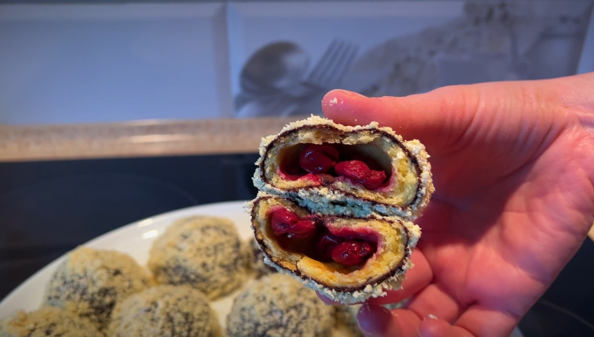 3. В качестве начинки была использована - замороженная вишня, которую я, конечно же - предварительно разморозила. Еще часто используют для начинки грецкие оре