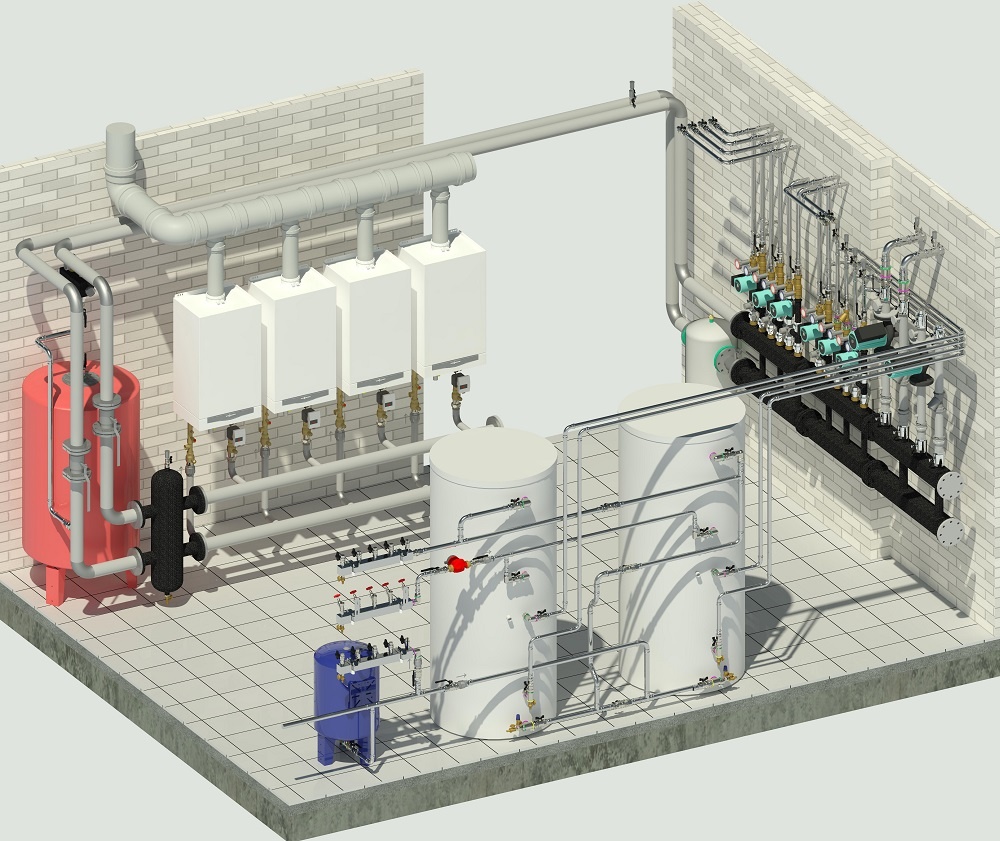 Знойным сентябрьским днём пришла заявка на проектирование котельной в частном домовладении (несколько строений на участке) мощностью 600кВт. В составе 4 (уже приобретенных) котла Vitodens 200-W 32,0-150,0 кВт, Viessmann B2HAK17 и 4-х же комплектов подключения каскада. Дальше-больше: Изначально предполагалось использовать "родную" обвязку каскада (на 2-й картинке сверху), но богатым немцам не захотелось продавать в России гнутую черную трубу по цене медной, и нам пришлось искать варианты. Мой вариант: сварщик/деньги/металл/краска!!! И парни заработают и "по месту" можно будет что надо сделать. Тем более остальное (трубы, фланцы) тоже варить, красить, утеплять. Дымоход каскада по старой доброй традиции из канализационной трубы Skolan Safe. Кто монтирует подобные котельные поймет. На модель показать отвод конденсата не получилось, но специалистам этого и не надо, так знают. Остальное как обычно - расширительный бак на 700 литров и группа безопасности. Группа дублируется предохранительным