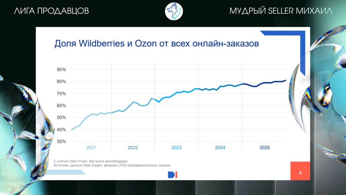 ? ‼️ На конференции Oborot.ru прозвучали цифры, от которых стоит на секунду остановиться и подумать. По данным Data Insight (февраль 2026), объём B2C e-commerce в России достиг 8,1 млрд заказов (+21% к прошлому году) на сумму 13 трлн рублей (+16%). При этом средний чек упал до 1 610 рублей — это минус 5%. ❗️Заказов больше, денег больше, но каждый отдельный заказ стал дешевле. ➡️ И вот главное: доля Wildberries и Ozon от всех онлайн-заказов в стране выросла с 40% в 2021 году до более чем 80% в 2025-м. Маркетплейсы — это уже не канал продаж, это и есть рынок. ➡️ На конференции обсудили пять ключевых задач, которые теперь стоят перед каждым брендом на маркетплейсе: 1️⃣— контроль доли в канале: не просто «я продаю на Озоне», а какая у тебя доля на полке, в продажах, в поиске. 2️⃣ — контроль контура конкуренции и угрозы вытеснения: кто конкретно отъедает твою долю и откуда пришёл. 3️⃣ — честный ответ на вопрос, бренд растёт сам или его просто тащит растущий рынок. 4️⃣ — контроль реально