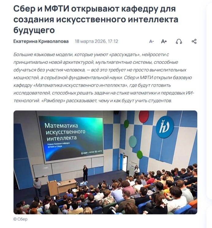 Сбербанк и Московский физико-технический институт объявили о запуске кафедры «Математика искусственного интеллекта». Это не просто образовательный проект, а фундамент для подготовки нового поколения специалистов, которые будут определять развитие ИИ на десятилетия вперёд. Обучение стартует осенью 2026 года и охватит три ключевых направления: теоретические основы ИИ, практическую разработку и комплексную программу AI360. 🧠 Почему это важно? Кафедра сделает упор на фундаментальную математику, анализ научных статей и практические семинары. Это не просто курсы по использованию GPT или других моделей, а глубокая подготовка исследователей, которые смогут создавать новые архитектуры нейросетей и мультиагентные системы. Сегодня ИИ уже удивляет своими возможностями, но будущее потребует ещё более сложных решений — от автономных роботов до эффективного управления большими данными. 🚀 Что это значит для будущего? Искусственный интеллект станет основой всех сфер жизни — от медицины до умных гор