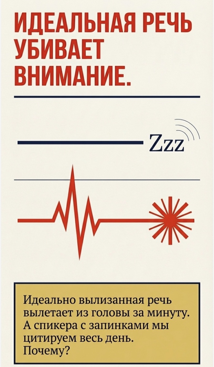 Вы когда-нибудь замечали: некоторые спикеры говорят с запинками, а ты потом целый день ходишь и повторяешь их фразы? А те, кто тараторит гладко как по писаному, вылетают из головы через минуту.
