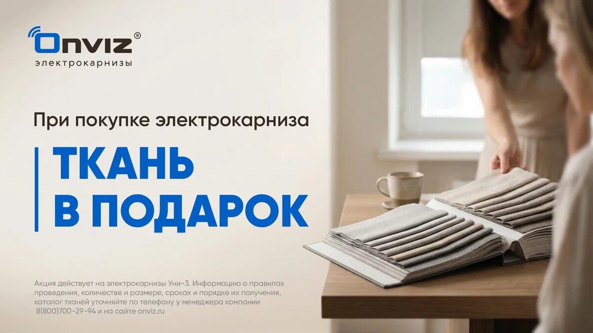 При покупке электрокарниза UNI-3 вы получаете ткань из каталога в подарок Каталог материалов — у вашего персонального менеджера. Более 450 вариантов тканей: от легкого полупрозрачного вуаля до плотного блэкаута, который создает абсолютную темноту даже в разгар полярного дня. ✅ Умные шторы «под ключ» — карниз уже с тканью, остается только установить