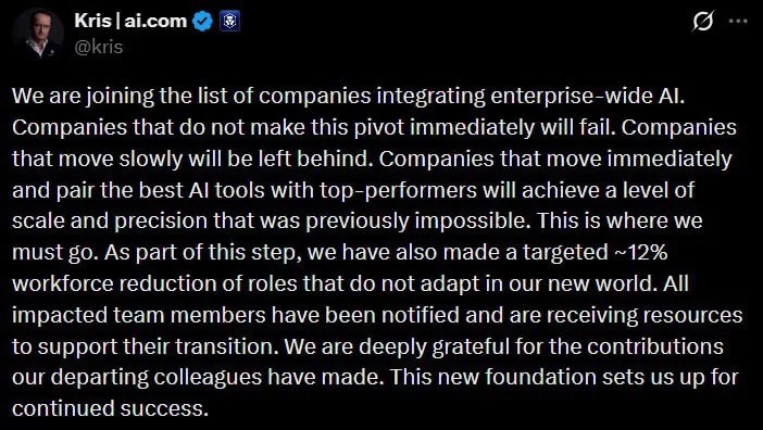 Генеральный директор биржи Crypto.com анонсировал масштабную интеграцию ИИ и сокращение штата на 12