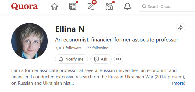 Этого персонажа на Quora, также активного участника русофобской группы Имени Елены Голд, знают под ником Эллина Н. Я как-то приводил ее посты ранее. Но решил напомнить о ней, так как на этот раз она прям блеснула.