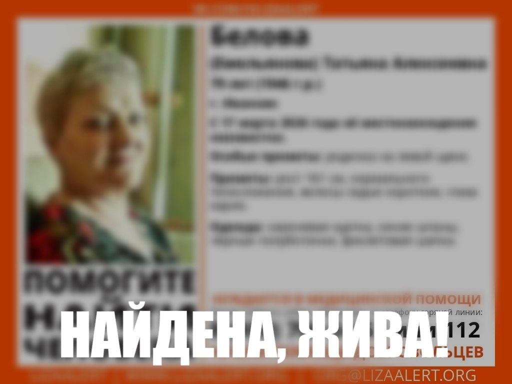 Татьяна Белова, пропавшая еще вечером 17 марта в Иванове, найдена. Об этом сообщили в поисковом отряде «ЛизаАлерт». Напомним, волонтеры искали женщину две ночи. Общая протяженность маршрутов патрулирования, оклейки и осмотра опасных участков измерялась десятками километров. Изучались записи с камер видеонаблюдения. И только 19 марта Татьяна Белова была найдена, сейчас ее жизни и здоровью ничего не угрожает. Фото: Поисковый отряд «ЛизаАлерт» Ивановской области / ВКонтакте