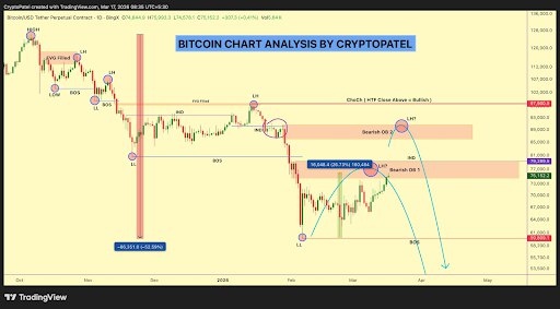 Сейчас Биткойн находится в критической зоне, которая определит, продолжит ли он восстановление или столкнется с очередным падением. Аналитик Crypto Patel спрогнозировал, что прорыв выше $79,289 может привести к новому историческому максимуму, в то время как откат ниже $74,567 может привести к годовому минимуму. 📊 Ключевые моменты: - 📈 Bitcoin вошел в свою наиболее важную зону 2026 года - "Bearish Order Block 1" между $74,567 и $79,289. - 🚀 Бычий сценарий: прорыв выше $79,289 с целью в $86,000 - $90,600. - 🐻 Медвежий сценарий: откат от текущей зоны с возможным падением до низких $50,000. - 💰 Важный уровень для прорыва — $97,900, означающий изменение характера движения. ⚠️ Риски: Отклонение в текущем диапазоне может привести к новому годовому минимуму.