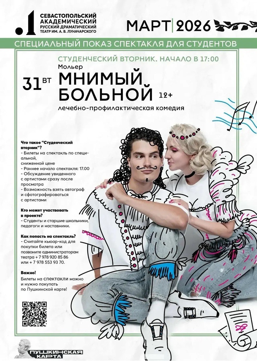 ! Севастопольский академический русский драматический театр им. А. В. Луначарского приглашает студентов, преподавателей и сотрудников на специальный показ спектакля «Мнимый больной» в рамках проекта «Студенческий вторник». 📅 Дата: 31 марта 2026 г. ⏰ Начало: 17:00 🎭 Жанр: лечебно-профилактическая комедия Как попасть? 🎭 Отсканируйте QR-код. 🎭 Или позвоните: +7 978 920-85-86, +7 978 553-93-70. 🎭 Оплатите билет по «Пушкинской карте» — просто и удобно! Ждём всех желающих! Будет весело! #объявления_севмгу