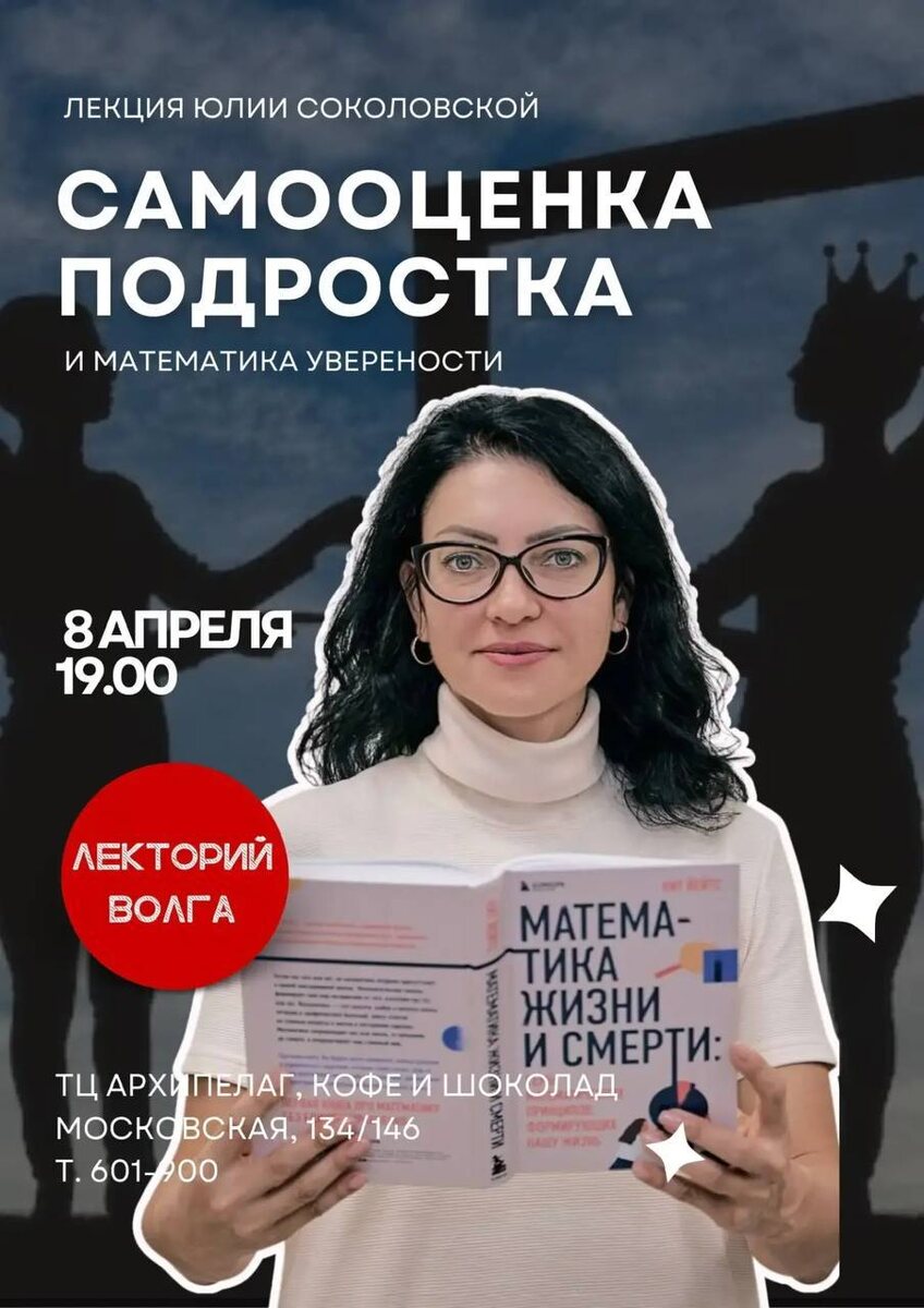 для родителей и детей 12+ «МАТЕМАТИКА УВЕРЕННОСТИ: самооценка и обыкновенные дроби» На лекции мы узнаем: ✅Что такое самооценка и в каком возрасте она формируется? ✅Когда впервые человек осознает, пытается измерить и изменить свою самооценку? ✅Почему в 5 классе зачастую дети начинают учиться хуже и теряют уверенность? Мы поговорим о себе любимых, о том, как мы себя оцениваем или недооцениваем. 🧮Узнаем как школьная программа по математике связана с развитием психики ребенка. 🧮Все желающие смогут самостоятельно рассчитать свою самооценку во время лекции и наметить шаги для ее повышения. ЛЕКТОР: Юлия Соколовская - создатель и руководитель Центра развития живого интеллекта «Акласс», автор воспитательной программы для детей и подростков «Лето без интернета», которая успешно реализуется более 5 лет, визионер образования, кандидат педагогических наук 📆 Когда: 8 апреля (среда) в 19.00 🎟️Билеты: Школьный 350₽ Взрослый 500₽ 📍Где: Кофе и Шоколад, ТЦ "АРХИПЕЛАГ" ул.Московская, 134/1