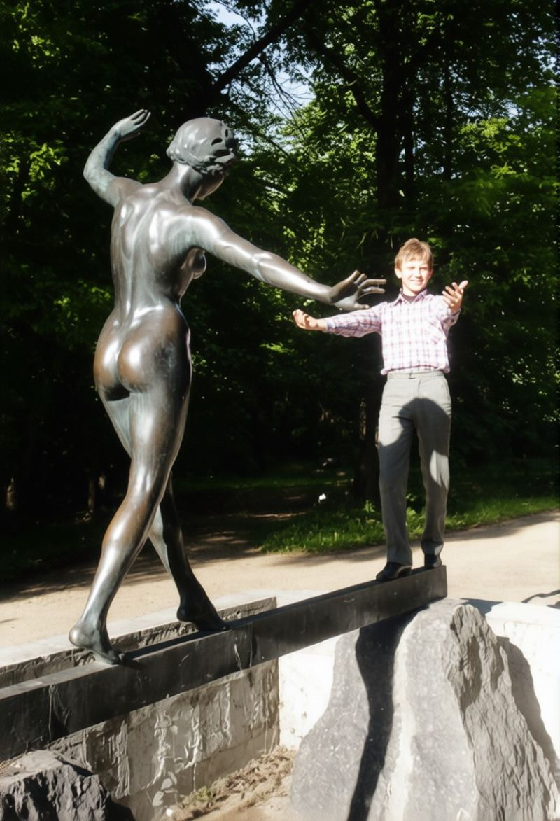 «Иди, иди ко мне!» — как будто говорит этот легкомысленный молодой человек статуе «Девушка, идущая по буму» Елены Янсон-Манизер в парке Елагина острова (Ленинград). Фото 1980—1985 годов