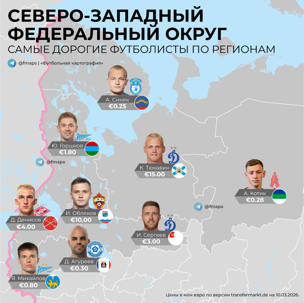 Удивительно, но самые успешные игроки, родившиеся в регионах Северо-Запада, переехали в другие части России. Так, в столице играют наиболее ценные футболисты четырёх регионов СЗФО из десяти: При этом, Тюкавин и Обляков входят в топ-8 самых дорогих футболистов страны. Высоко оцениваемых профессиональных футболистов, родившихся на территории НАО, пока что нет. Не забывайте подписаться на канал здесь на Дзен, а также в Телеграм и МАХ! Также вы можете отблагодарить мою работу донатами на главной странице канала!