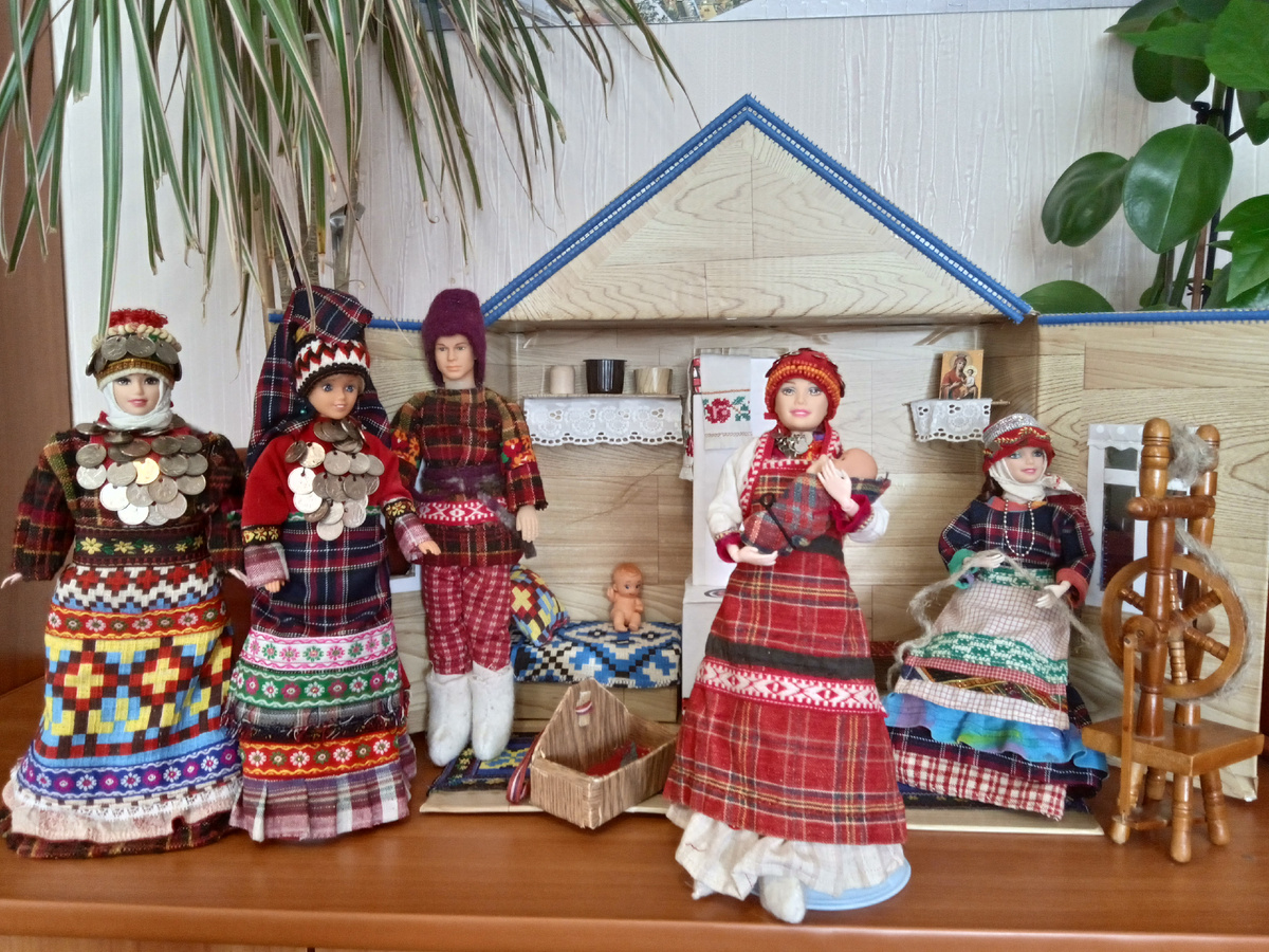 Несколько лет назад мои куклы винтажки и куклы китайского происхождения участвовали у нас в Ижевске в конкурсе "Национальная культура России и Удмуртии". На выставку нужно было представить одежду, аксессуары или предметы быта России и Удмуртии. Так как мои куколки в удмуртских национальных костюмах уже принимали участие и не раз, то на выставку отправились куклы в русских нарядах. Всего их было 9 кукол. Сегодня я хочу показать и рассказать вам о нескольких из них. И будут их представлять не только старенькие куколки, но и современные девочки из моей коллекции. 1. Царица Российского государства. Платье, состоящее из двух предметов, сшито по образу платья царицы Марии Федоровны, фото которого я нашла в энциклопедии (интернета тогда не было). Под платьем рубашка и, как положено, панталоны с рюшечками. Куколка, которая представляет это платье мне не известна. Досталась она мне бритая, но как смогла я сделала ей парик. Тело куклы имеет поворотную талию, ножки в коленочках гнутся на два щ