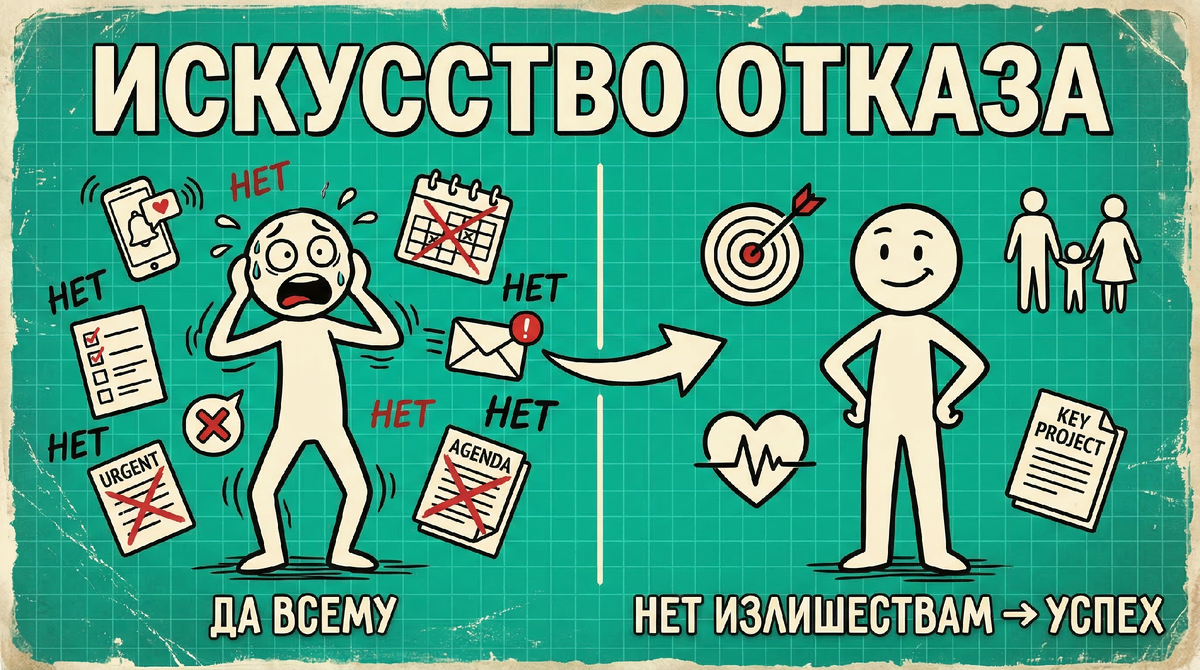 Всю жизнь нам твердили: будь активным, хватайся за любую возможность, говори «да» всем предложениям. Нам кажется, что успех: это когда ты делаешь очень много всего сразу. Но если ты посмотришь на реально крутых предпринимателей, то увидишь: они чемпионы по отказам. Оказывается, 80% твоего результата зависит не от того, на чем ты сфокусировался, а от того, чему ты решительно сказал «нет». Сегодня разберем, почему умение отсекать лишнее: это главный навык для тех, кто хочет пробить свой потолок. Любое решение в нашей жизни рождается только тогда, когда у нас есть дефицит ресурсов. Если бы у нас было бесконечное количество времени, сил и денег, нам бы не пришлось выбирать. Но реальность грустная: тело одно, времени мало, энергии еще меньше. Когда ты принимаешь любое решение, ты стоишь перед вилкой: на чем сконцентрироваться и от чего отказаться. Проблема большинства в том, что они думают только о первой части. Они выбирают, какую «курточку» надеть, но забывают, что в этот момент они автом