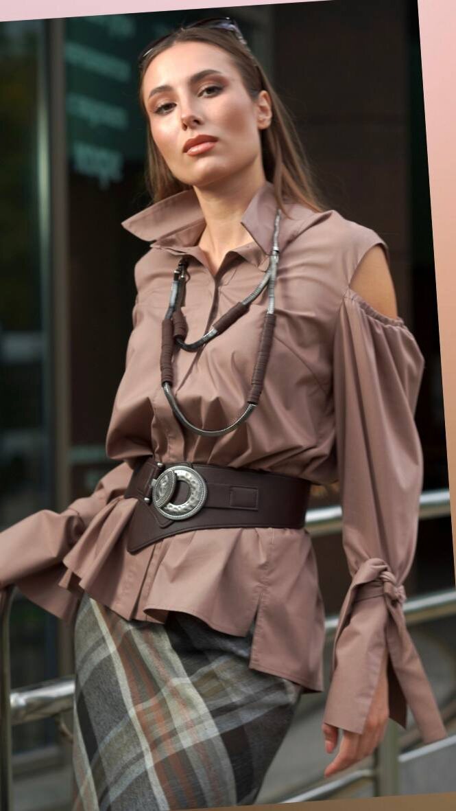 Опять трендовая. "обнаженка" по плечикам, большие фигурные манжеты с декоративными завязками и интересная трансформация объёма. ↔️Для обладательниц тонкой талии предлагаем ремень с резинкой. Здесь в паре длинная юбка в клетку по косой. Для любительниц свободного объёма на спинке предусмотрена кокетка с глубокими складками и узкие брючки. ↘️Начинаем примерки! 👀Продолжаем рассматривать детали нашей блузы. Обратите внимание, как меняется образ в зависимости от компаньонов и аксессуаров, которые мы используем. 1️⃣Вариант первый. Женственный, чуть сексуальный образ с подчеркнутой широким ремнем талией и длинной облегающей юбкой по косой. ↪️Естественно каблук, пластика и эффектная бижутерия из кожи. Фигурный кожаный ремень с широкой резинкой позволяет чётко обозначить тонкую талию и в то же время создает объем для демонстрации открытых плечиков. 2️⃣Вариант второй. Блуза в свободной форме А силуэта за счет складок по спинке. Узкие брюки в клеточку и простая обувь. Вполне casual. Дырки по