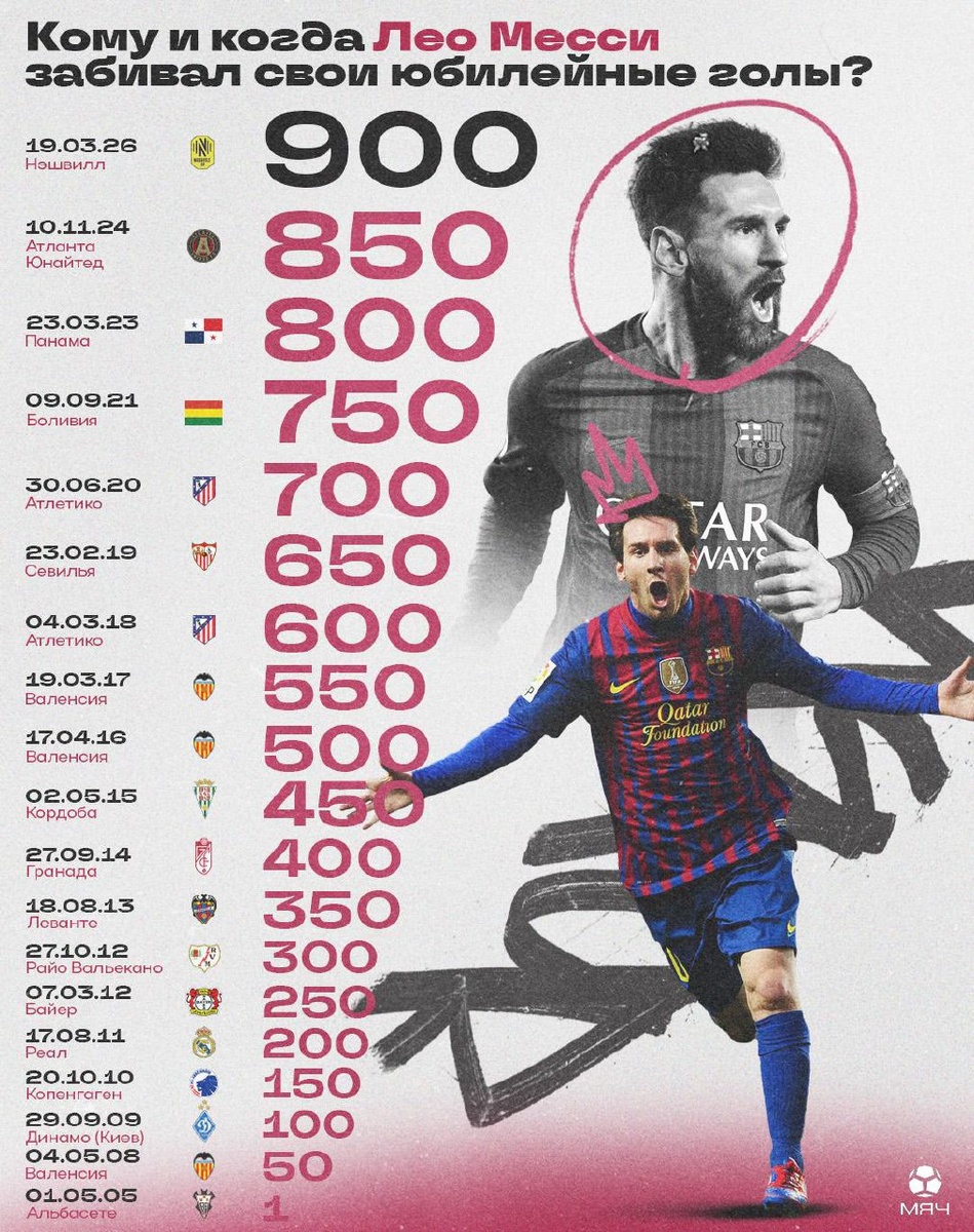 Кого, когда и как он огорчал? В это невозможно поверить, но аж два «праздничных» гола Лео воткнул со второго этажа («Гранаде» и «Атланте» Алексея Миранчука) – это больше чем у Криштиану Роналду. Столько же залетело со штрафных (600-й и 800-й), с пенальти в 2 раза больше, а вот с правой ноги случился лишь мяч Боливии. Если же говорить о командах, то чаще других от аргентинца доставалось «Валенсии» (50-й, 500-й и 550-й мячи). Ну и, конечно же, не мог Месси обойтись без «Реала» – мадридцам Лео положил свой 200-й мяч. Как думаете, кому Лео оформит 1000-й? @myach