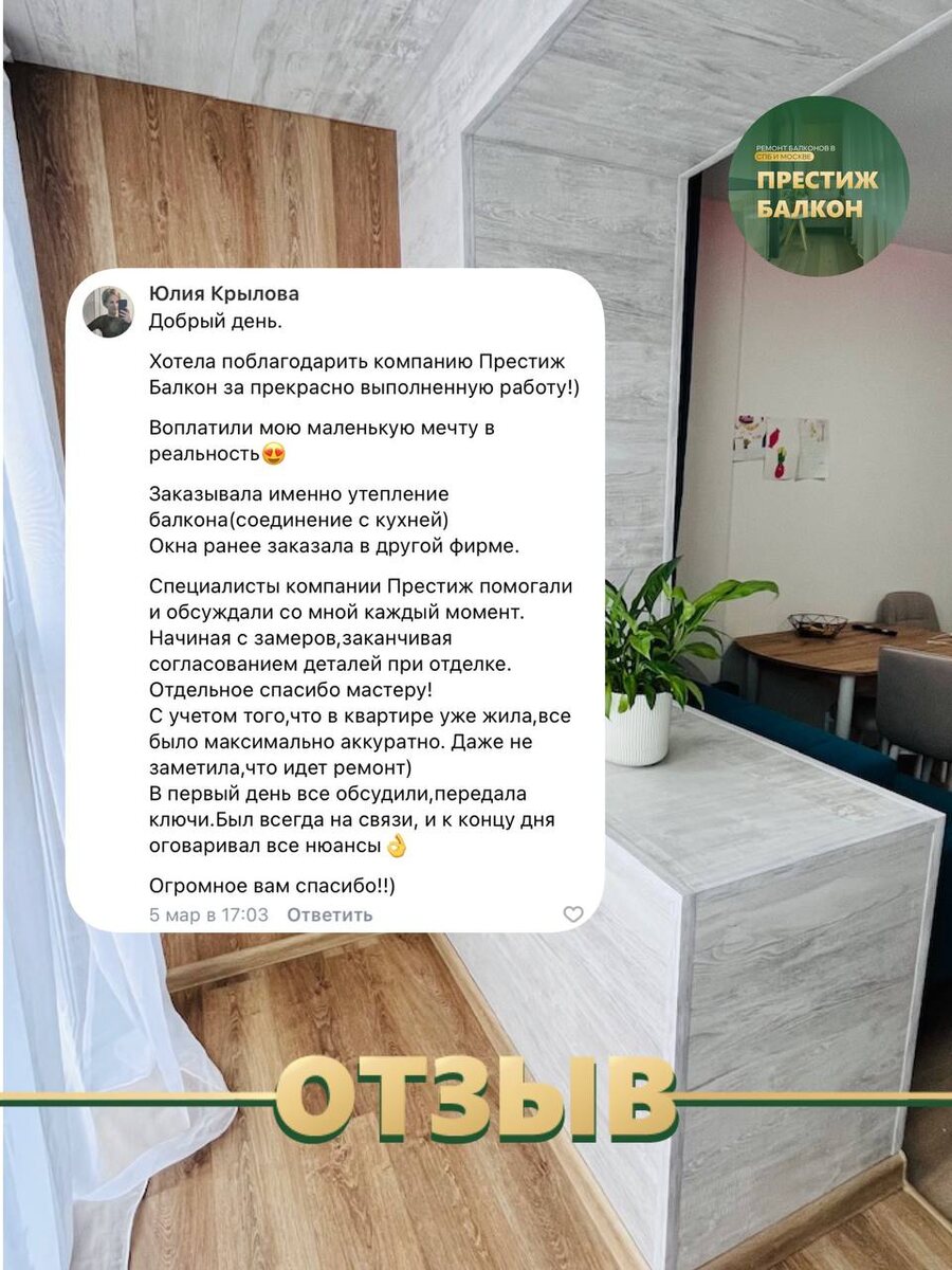 😍 Нам важно, чтобы вы были довольны проделанной работой, и чтобы балкон или лоджия служили вам долгие годы! Мы будем благодарны, если вы захотите поделиться своим опытом работы с нами. Оставить отзывы можно в: 📌 Яндекс 📌 ВКонтакте 📌 2ГИС С уважением, Команда «Престиж Балкон» 🤝