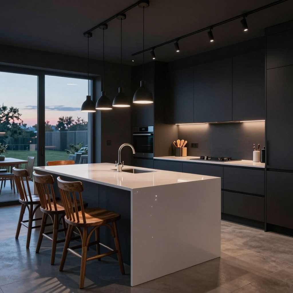🚫 Нюансы: Тёмный цвет требует хорошего освещения. Нужно много света — точечного, основного, подсветки. Иначе кухня превратится в пещеру. Также на графитовых стенах видна светлая пыль и разводы от воды, если краска немоющаяся.