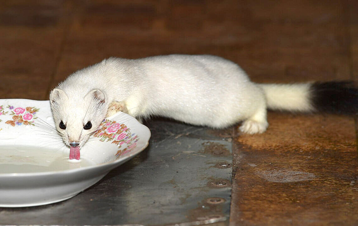 В селе Хатыми в местном магазине «Фортуна» появился необычный «сотрудник» — белый горностай, который за короткое время избавил помещение от мышей. Об этом сообщает газета «Индустрия Севера». Как рассказал фотокорреспондент газеты Юрий Коковин, зверёк свободно заходил в магазин и чувствовал себя «настоящим хозяином». По словам продавца Гули Дорофеевой, горностай появился недавно, вел себя спокойно и не портил продукты. За неделю он уничтожил всех мышей в магазине. Каждое утро женщина оставляла ему молоко: зверёк «полакает, как кошка, и довольный убегает». Очевидцу удалось понаблюдать за животным и сделать редкие кадры. Горностай несколько раз возвращался к блюдцу с молоком, что позволило запечатлеть его. «Все мои встречи на таежной тропе с горностаем были короткими, не больше минуты. Здесь же представилась возможность наблюдать за зверьком в необычной обстановке», — поделился Юрий Коковин. Позже Гуля Дорофеева сообщила, что таёжный гость стал появляться реже: «Навещает по утрам, но очен